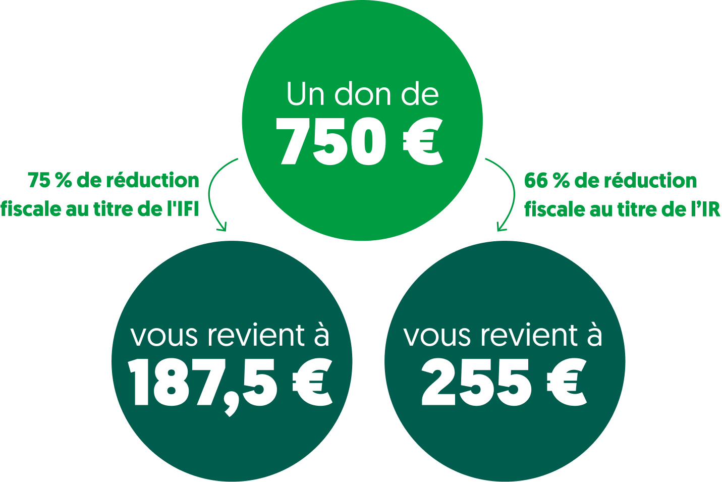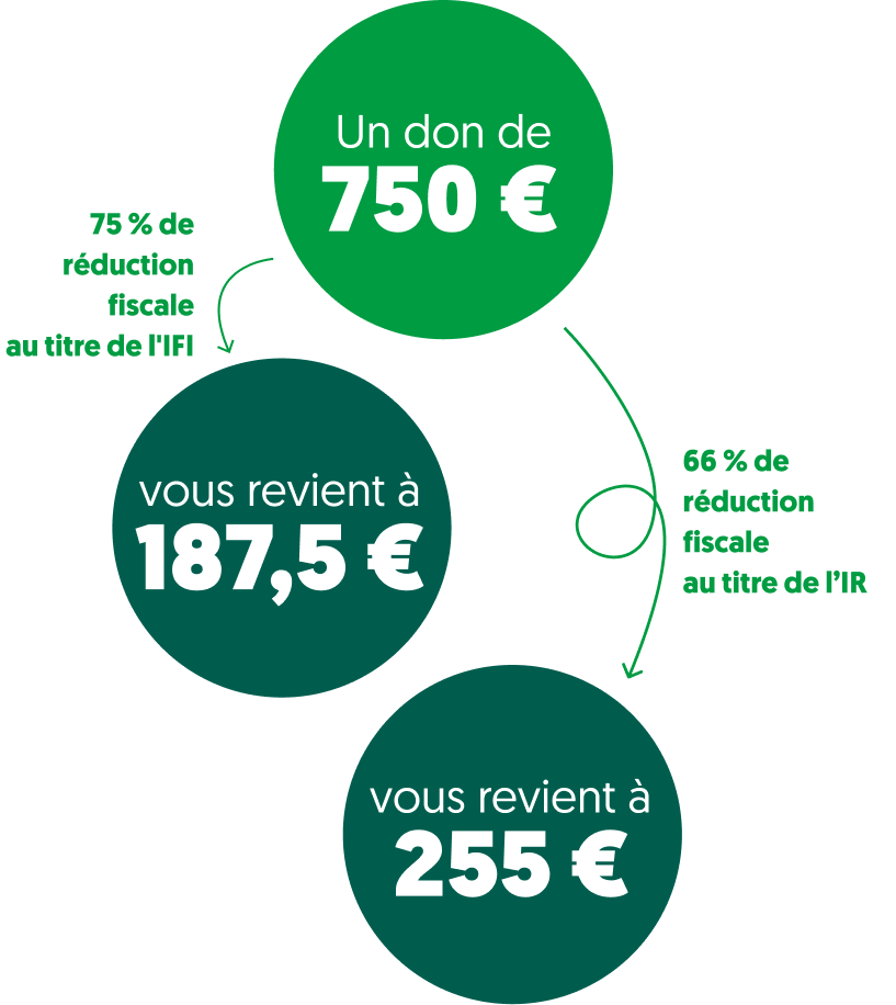 Par exemple, en donnant 1 000 € au titre de l’IFI, votre don vous reviendra à 250 € (75 % de réduction fiscale) et en donnant 1 000 € au titre de l’IR, il vous reviendra à 340 € (66 % de réduction fiscale).